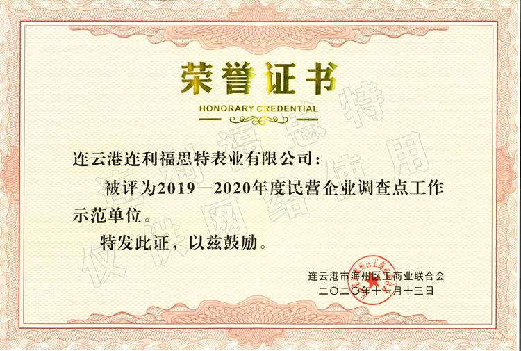近日,連云港連利福思特表業(yè)有限公司榮獲“2019-2020年度民營(yíng)企業(yè)調(diào)查點(diǎn)工作示范單位”稱(chēng)號(hào)。 民營(yíng)企...